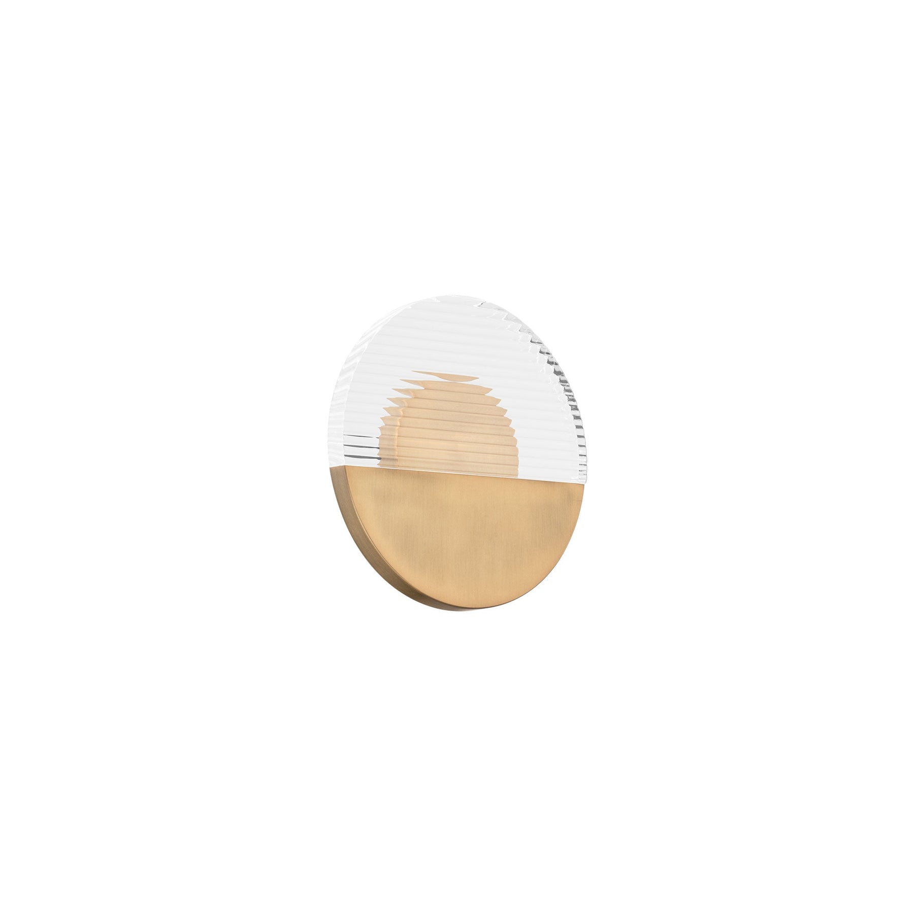 Crescent 10in LED Wall Sconce 3000K in Aged Brass. Wax and wane. Like a crescent moon playing hide and seek with the stars and slipping softly through the sky. Clear, ribbed acrylic throws lovely illumination to the room, while subtle down light is delivered from this luminaire’s solid canopy. Features an aluminum body construction with a ribbed acrylic diffuser ADA compliant AC LED (no transformer or driver needed for ease of installation over any junction box) Smooth and continuous dimming with an electronic low voltage (ELV) or TRIAC dimmer High Powered Replaceable LED Module; CRI: 90; Rated Hours: 50,000; Selectable Color Temp: 2700K-3000K-3500K-4000K Standards: ETL & cETL UL 1598 listed for Damp Locations, ADA Compliant
