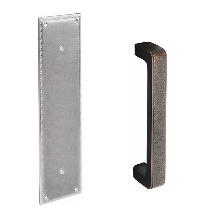 This pull plate set is designed for any door in your home or business (such as entryway or hallway doors). It is constructed from solid brass and measures 3 inch wide by 12 inches tall. The handle C-to-C measures 8 Inches. The handle is Concealed Surface mounted. Comes in a variety of finishes.