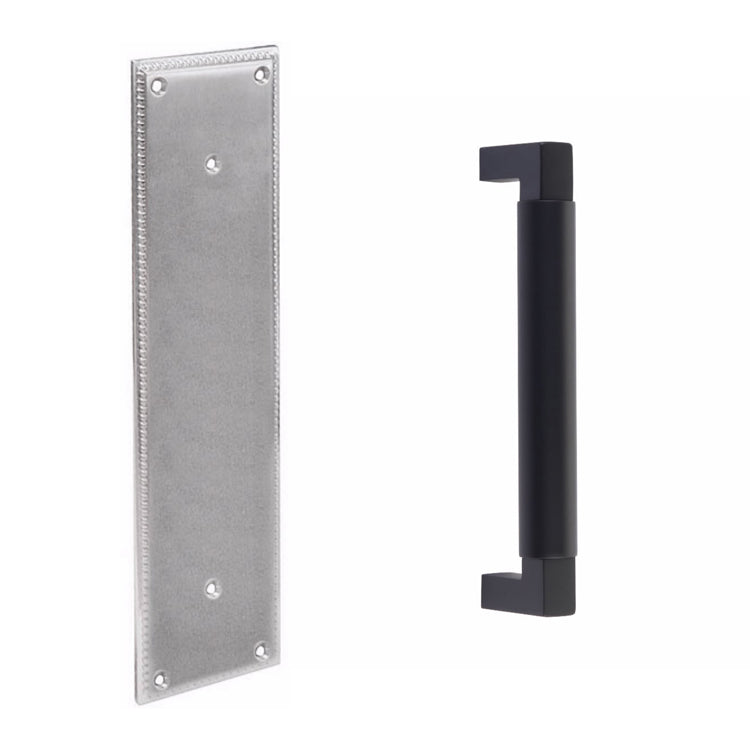 This pull plate set is designed for any door in your home or business (such as entryway or hallway doors). It is constructed from solid brass and measures 3 inch wide by 12 inches tall. The handle C-to-C measures 8 Inches. The handle is Concealed Surface mounted. Comes in a variety of finishes.