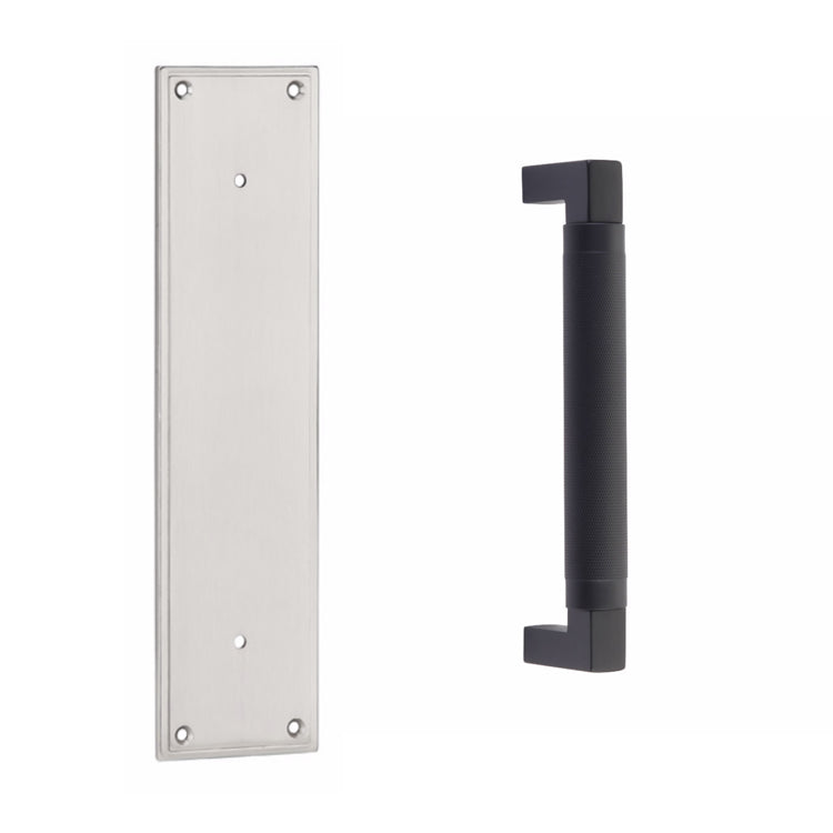 This pull plate set is designed for any door in your home or business (such as entryway or hallway doors). It is constructed from solid brass and measures 3 inch wide by 12 inches tall. The handle C-to-C measures 8 Inches. The handle is Concealed Surface mounted. Comes in a variety of finishes.