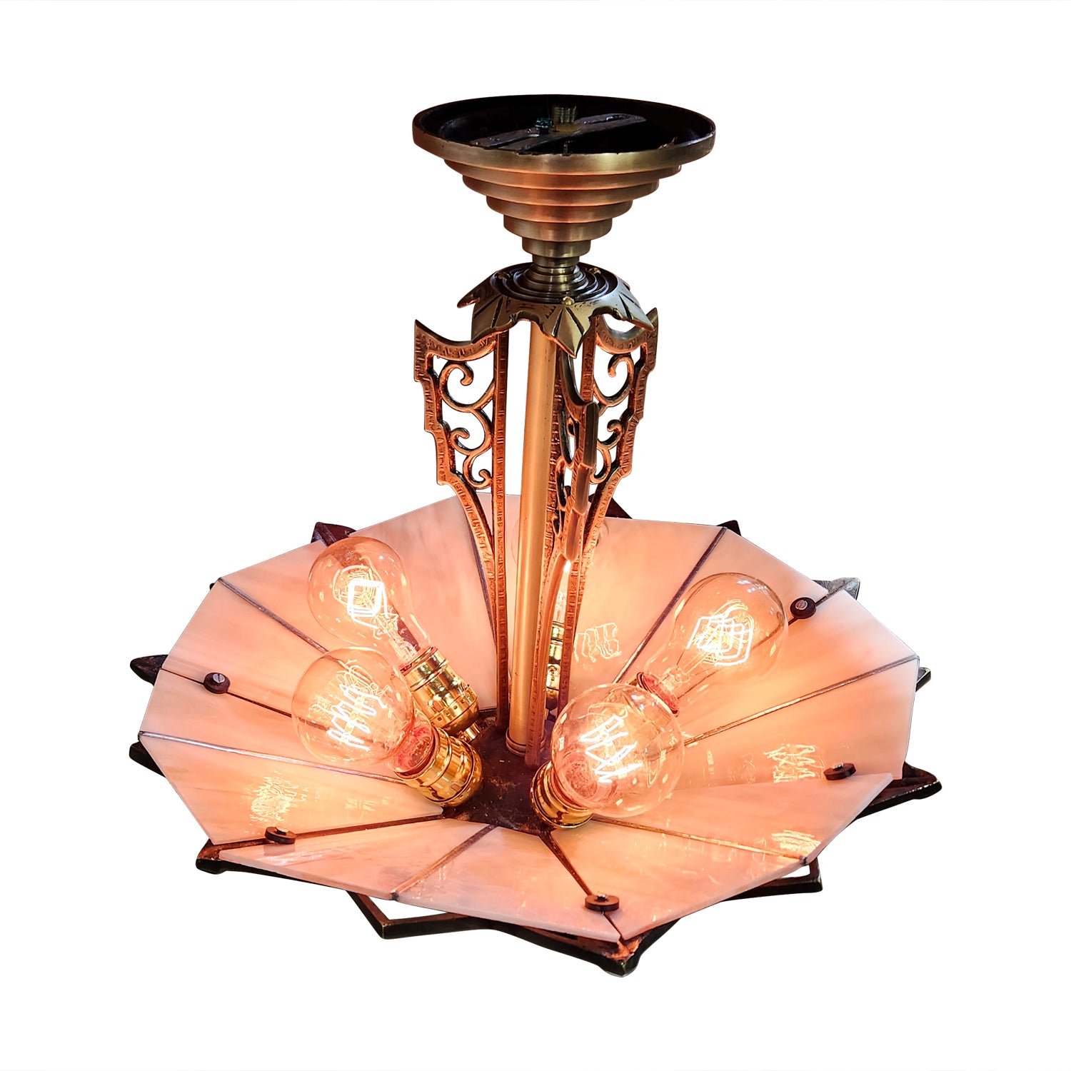 This item is hand crafted from solid brass using the Lost Wax casting method and this comes with stained glass panels that are made in Michigan. The chandelier's overall height measures approximately 17 inches with a 16 1/2 inch diameter. This close ceiling light is made from solid brass construction and weighs approximately 12.5 pounds. This uses five bulbs (maximum of 50 Watts each) and this fixture comes complete with the mounting hardware.