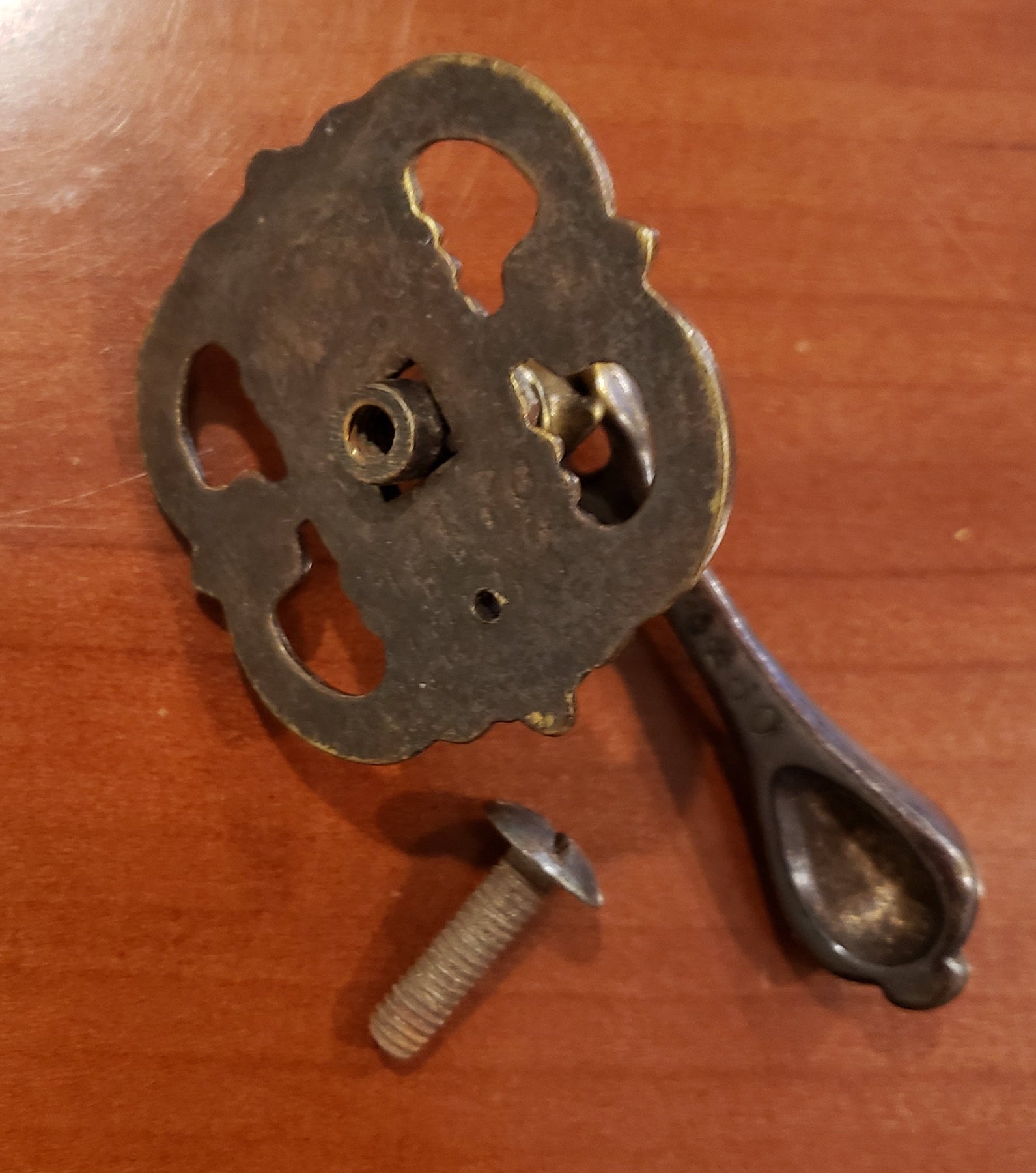This is an ornate and original drop pull shown in an Antique Brass finish. It measures approximately 2 1/2 inches by 1 1/2 inches.