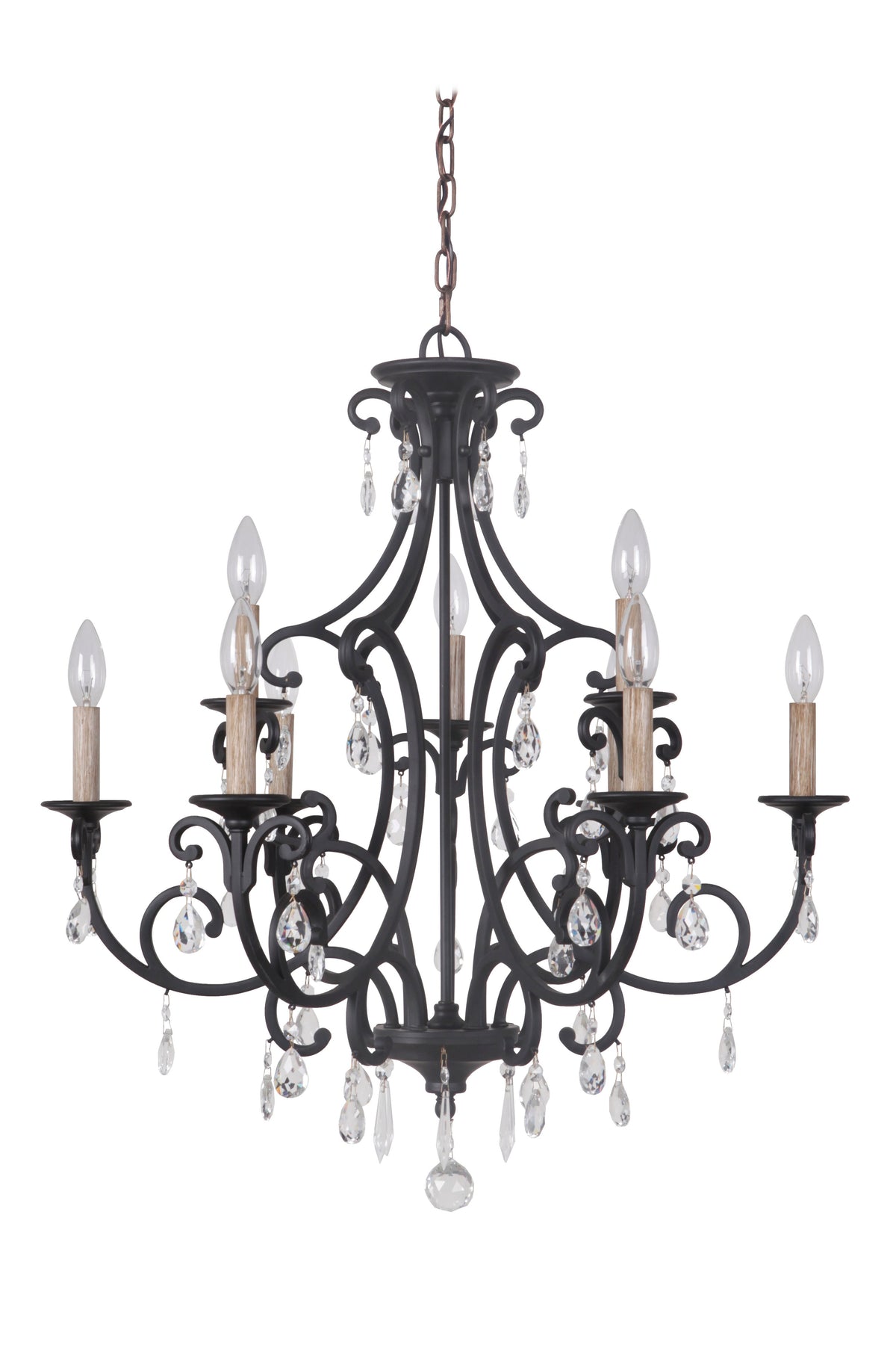 The Bentley 9 Light Chandelier in Matte Black is a stunning centerpiece for any indoor space, featuring intricate scrollwork and beautiful clear crystal accents that evoke the charm of hand-crafted wrought iron. It requires nine E12 candelabra base bulbs (not included), each with a maximum wattage of 60W. With dimensions of 26.50 inches in depth and width, and a height of 29.50 inches, this chandelier is perfect for adding elegance to your home. It comes with a 9FT chain for easy installation and is backed by a 1-year limited warranty.