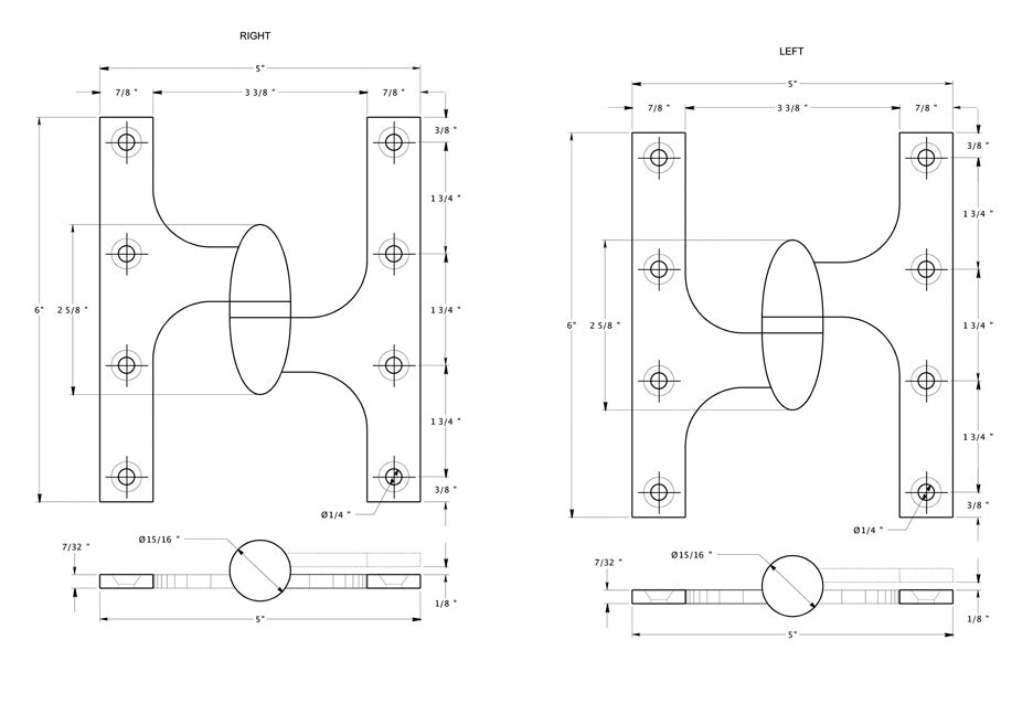 This hinge measures 6 inches tall by 5 inches wide. The hinge comes complete with the mounting hardware. This particular product has a lead time of approximately 3 to 5 business days.