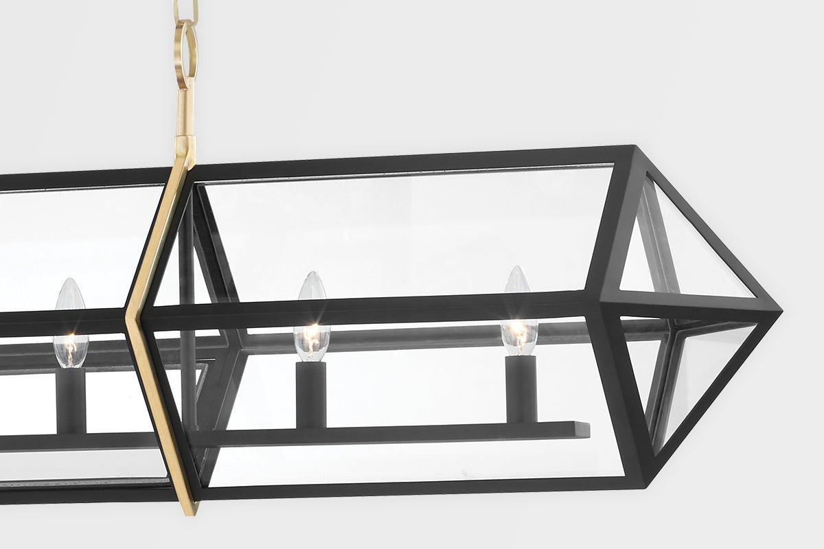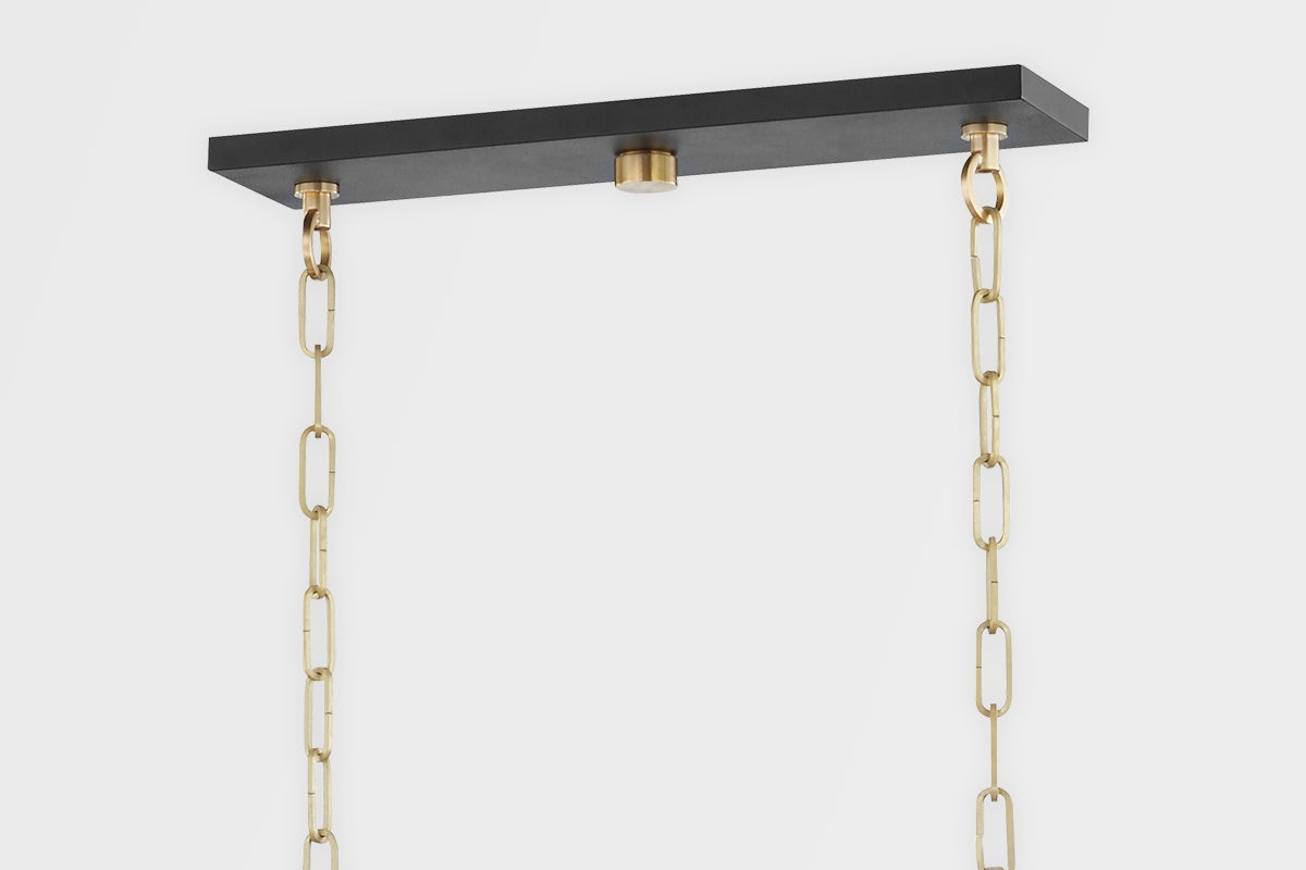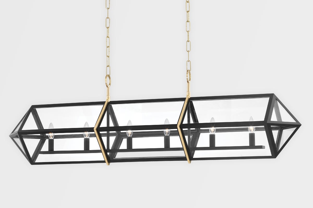 The Bedford Hills chandelier by Hudson Valley Lighting features a striking design optimized for elegance and functionality. With a width of 12.00 inches, a height of 16.50 inches, and a length of 55.25 inches, it houses six lamps utilizing E12 candelabra base sockets (bulbs not included), each with a wattage capacity of 40.00W. This chandelier is not plug-in, offering a clean installation, and is rated for UL Damp, making it suitable for humid environments. Available in an Aged Brass/Black finish (AGB/BK), it seamlessly complements various decor styles.