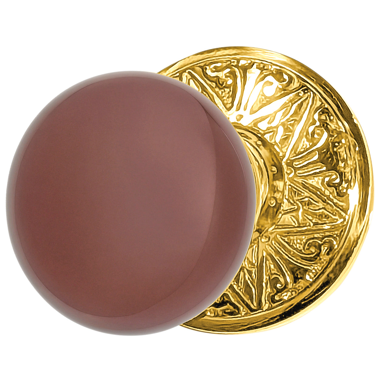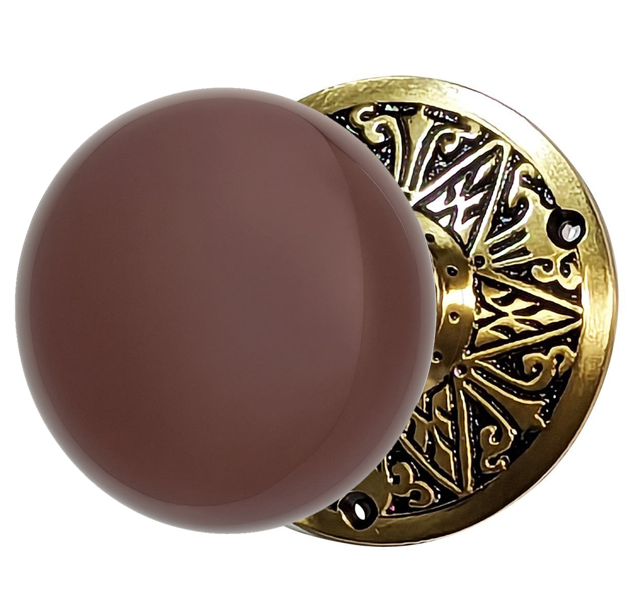 This exquisite door set features a genuine porcelain knob with an appealing Victorian rosette. It also features a design from the Yale & Towne era of 1884 and comes with a solid brass construction. The porcelain knob measures 2 1/8 inches in length (approximate) with a rosette that is 2 3/4 inches in diameter.