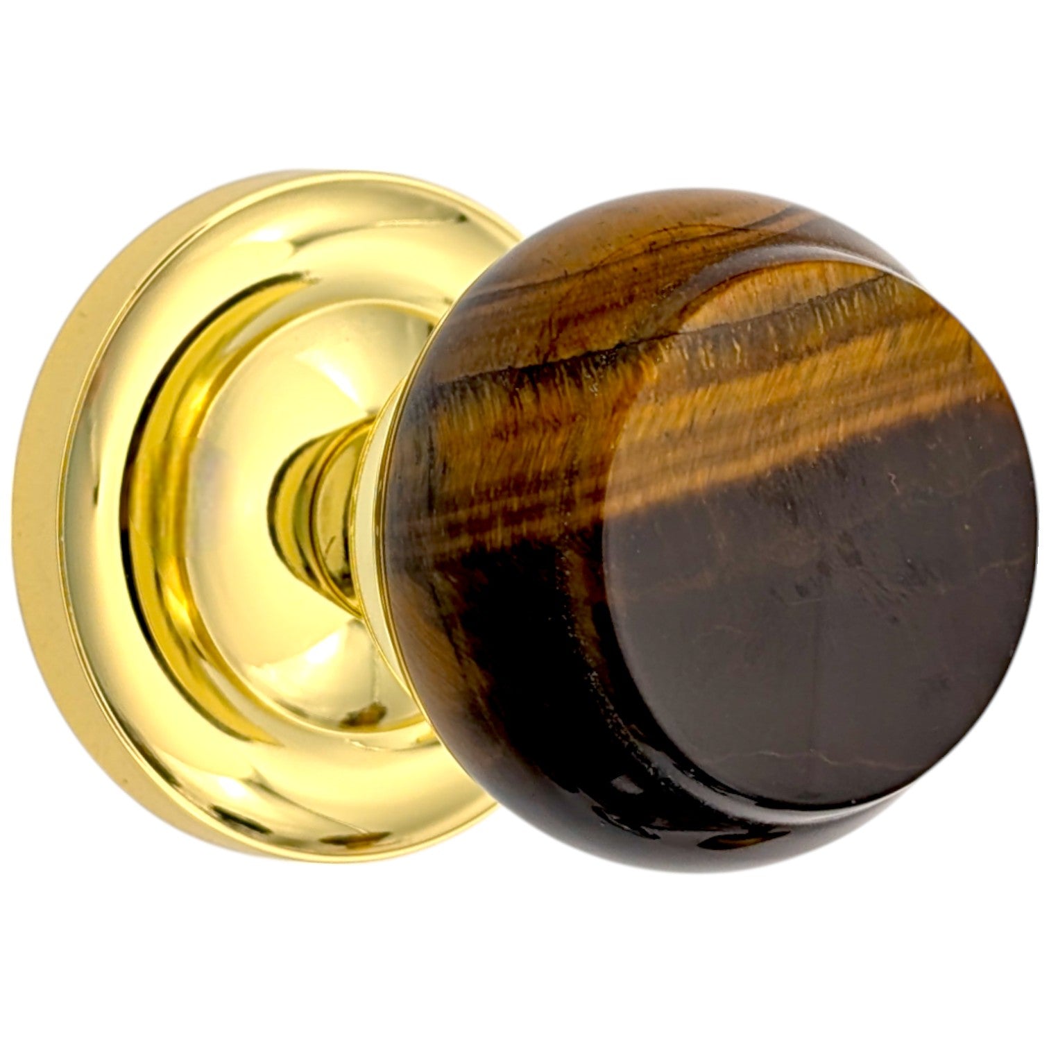 Experience luxury with the Magnifique Classic Door Set, crafted from solid brass and adorned with genuine Blue Tiger Eye knobs. Known for its deep, smoky tones with hints of blue and golden chatoyancy, each stone features distinctive natural banding and variation. Designed for both elegance and endurance, its PVD coating offers long-lasting protection. This high-end doorknob set installs effortlessly in under 2 minutes, bringing sophistication and quality to any home with ease. Usually ships within 1 to 2 business days after the order is placed.
