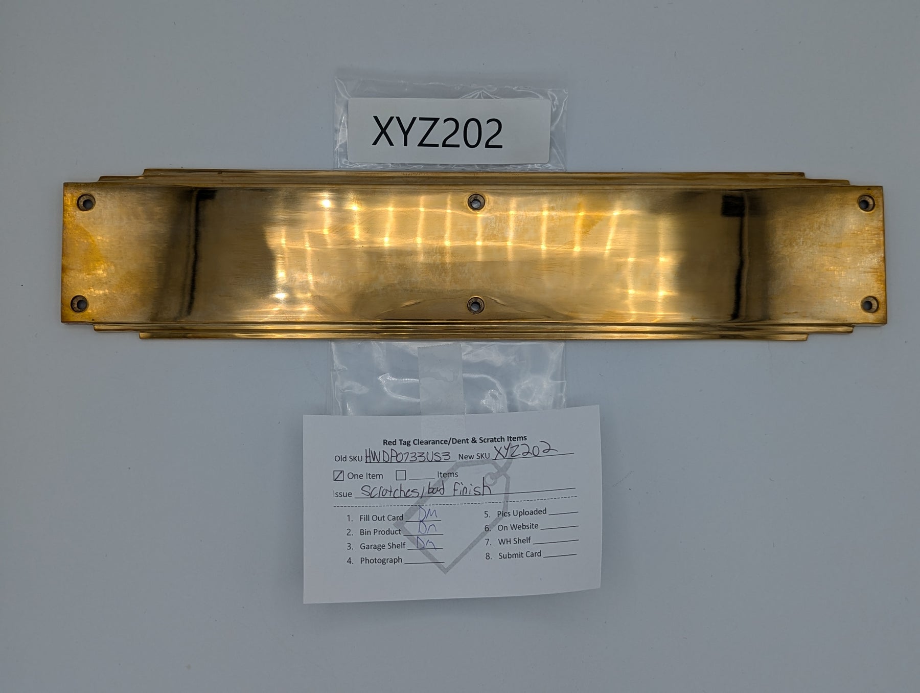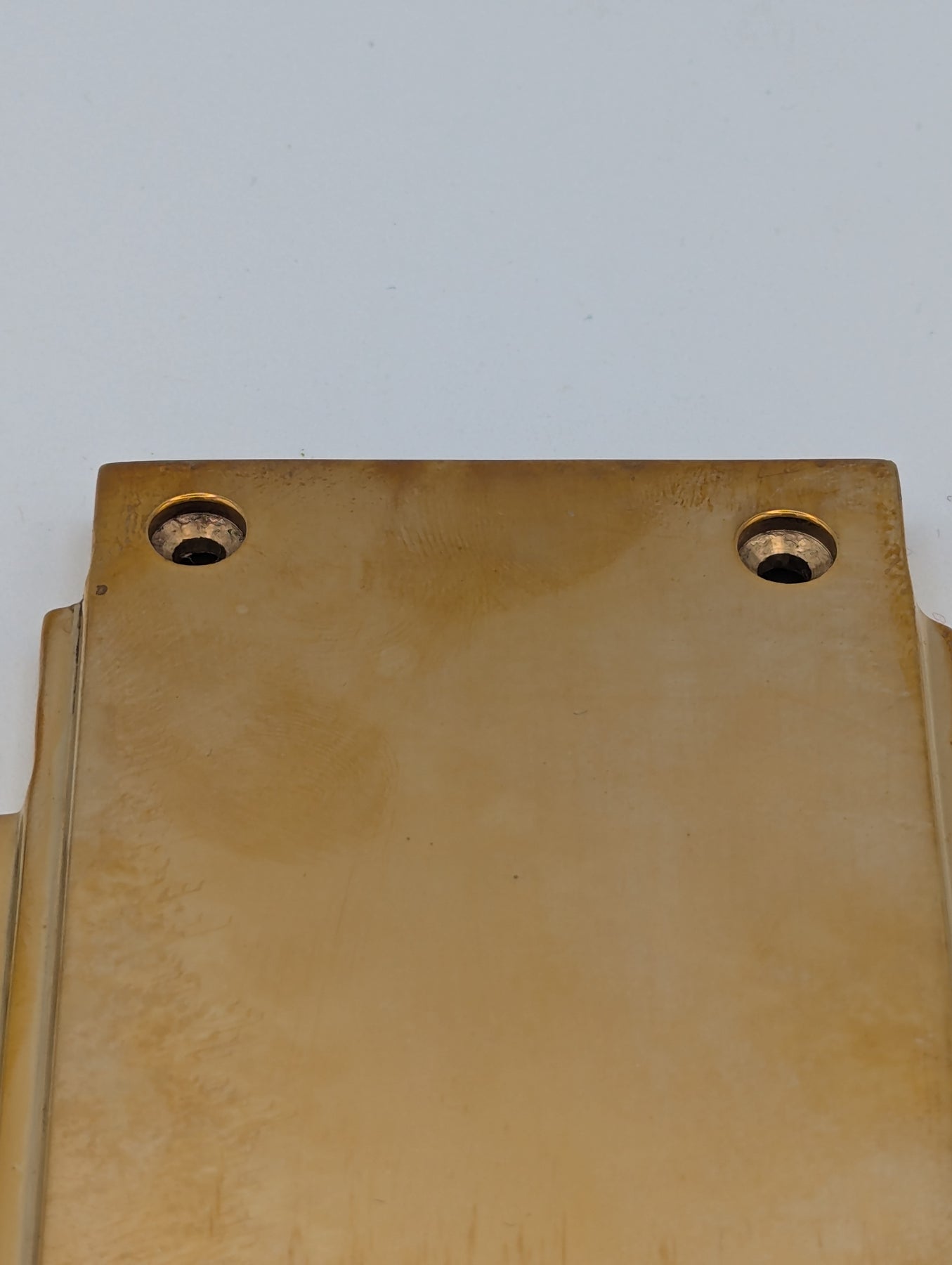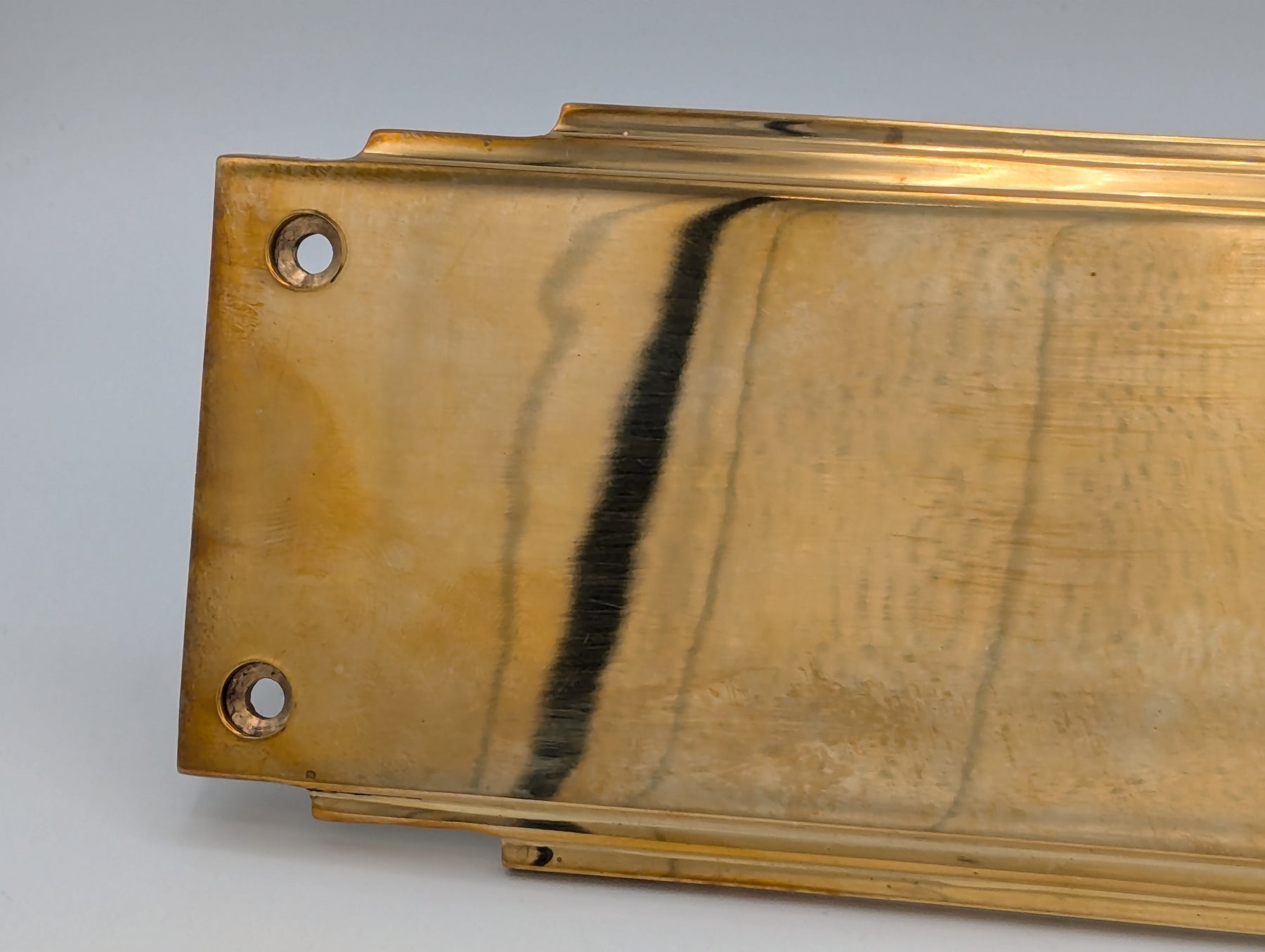 This Push Plate features an art deco style design. Hand finished and crafted from solid brass. Each plate measures 3 inch wide by 14 inch tall.
